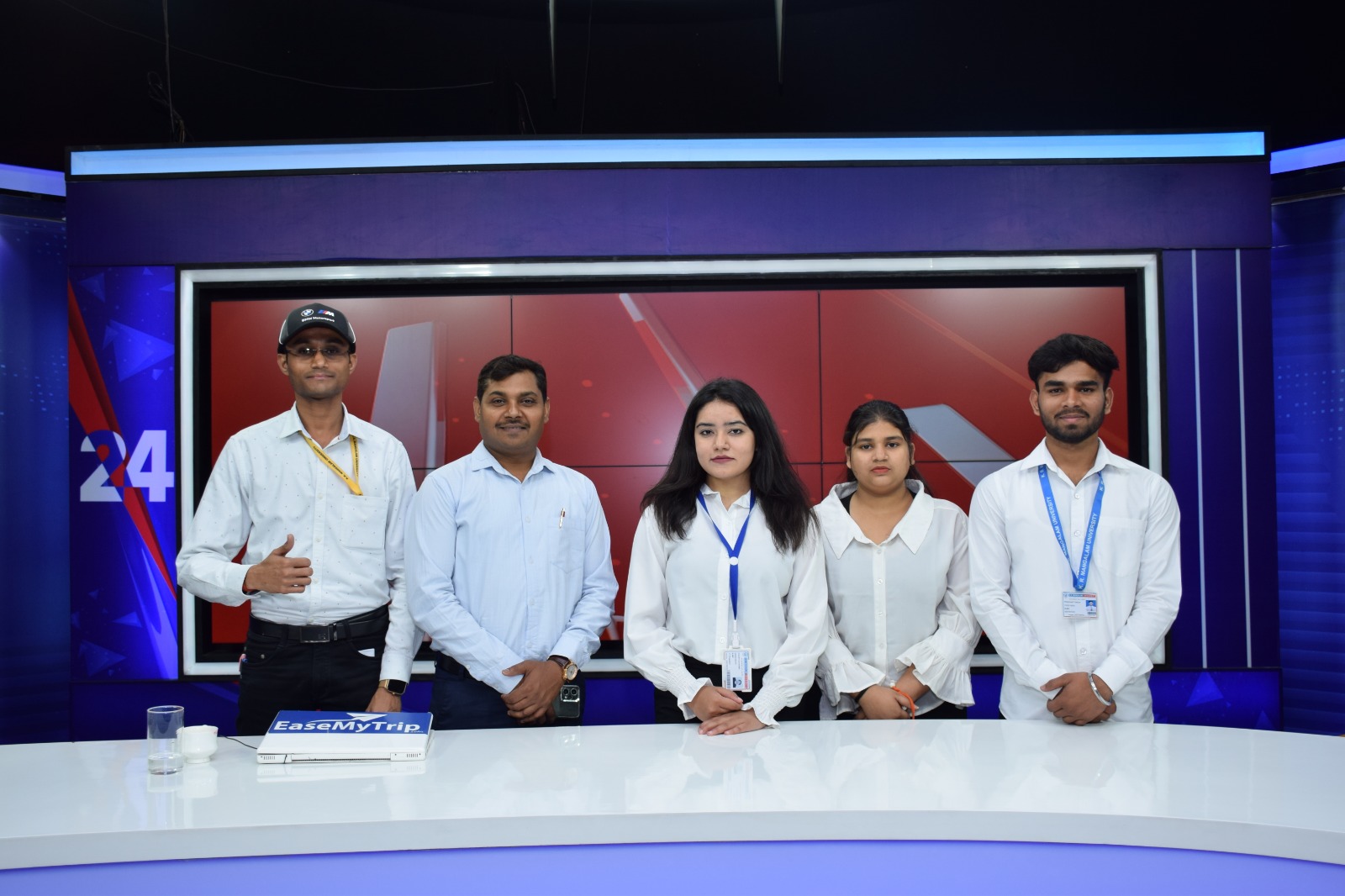On April 05, the School of Journalism and Mass Communication (SJMC), K.R. Mangalam University (KRMU) organized an industry visit for their students to News 24 Channel situated in Noida. The event was coordinated by Mr. Trilok Kumar Singh. The students of SJMC also attended a Live Conclave hosted by News 24 and visited the Prime Time Studio, PCR Room, Radio Studio, and the several regional channels of News 24.
